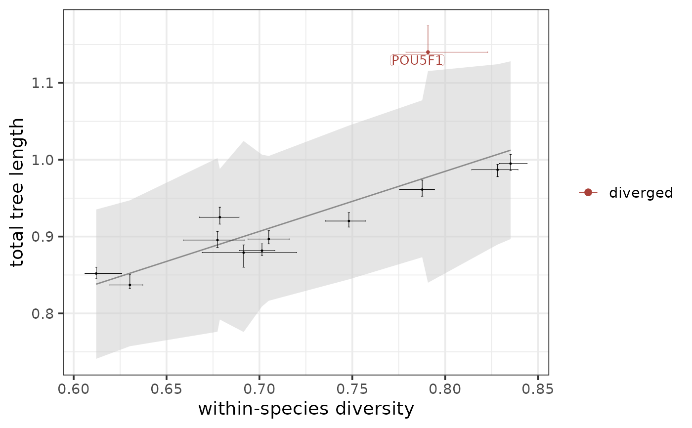 The function plots each input module along the regression line that captures the relationship between total tree length and within-species diversity (in case the focus of interest is conservation and overall divergence) or between the subtree length and diversity of a species (in case the focus of interest is divergence between this particular species and all others). A module is considered diverged overall/in a species-specific manner if it falls above the prediction interval of the regression line, while a module is considered conserved if it falls below the prediction interval of the regression line.