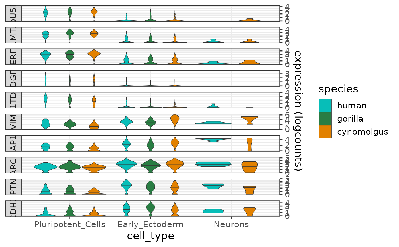 A violin plot as a ggplot object showing the expression distributions of the input genes per cell type and species.