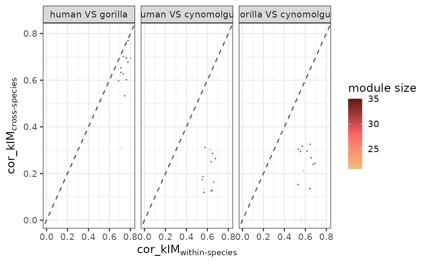 After calculating the summarized scores for all modules and species pairs, the cross-species scores are plotted against the within-species scores faceted by species pair. The within-species scores are expected to be higher than the cross-species scores, thus the data points are expected to fall under the diagonal in all facets. However, the more phylogenetically distant two species are, the bigger deviation we expect from the diagonal.