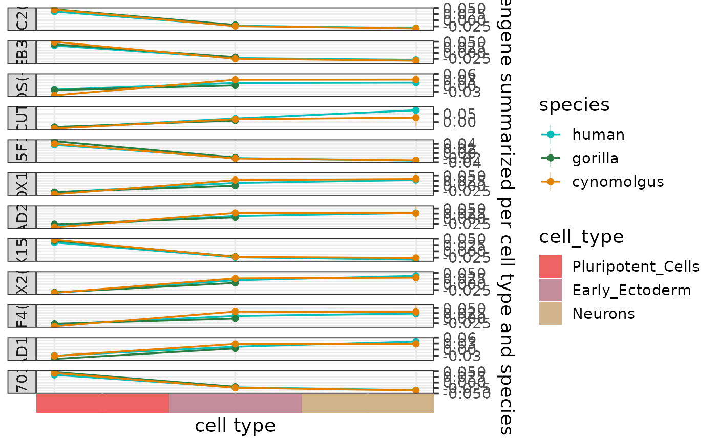 The summarized module expression levels are then visualized as a scatter plot across the cell types, colored by species and faceted by module. To aid visual comparison across species, the data points of the same species are connected by lines across the cell types (this is not meant to represent continuity).