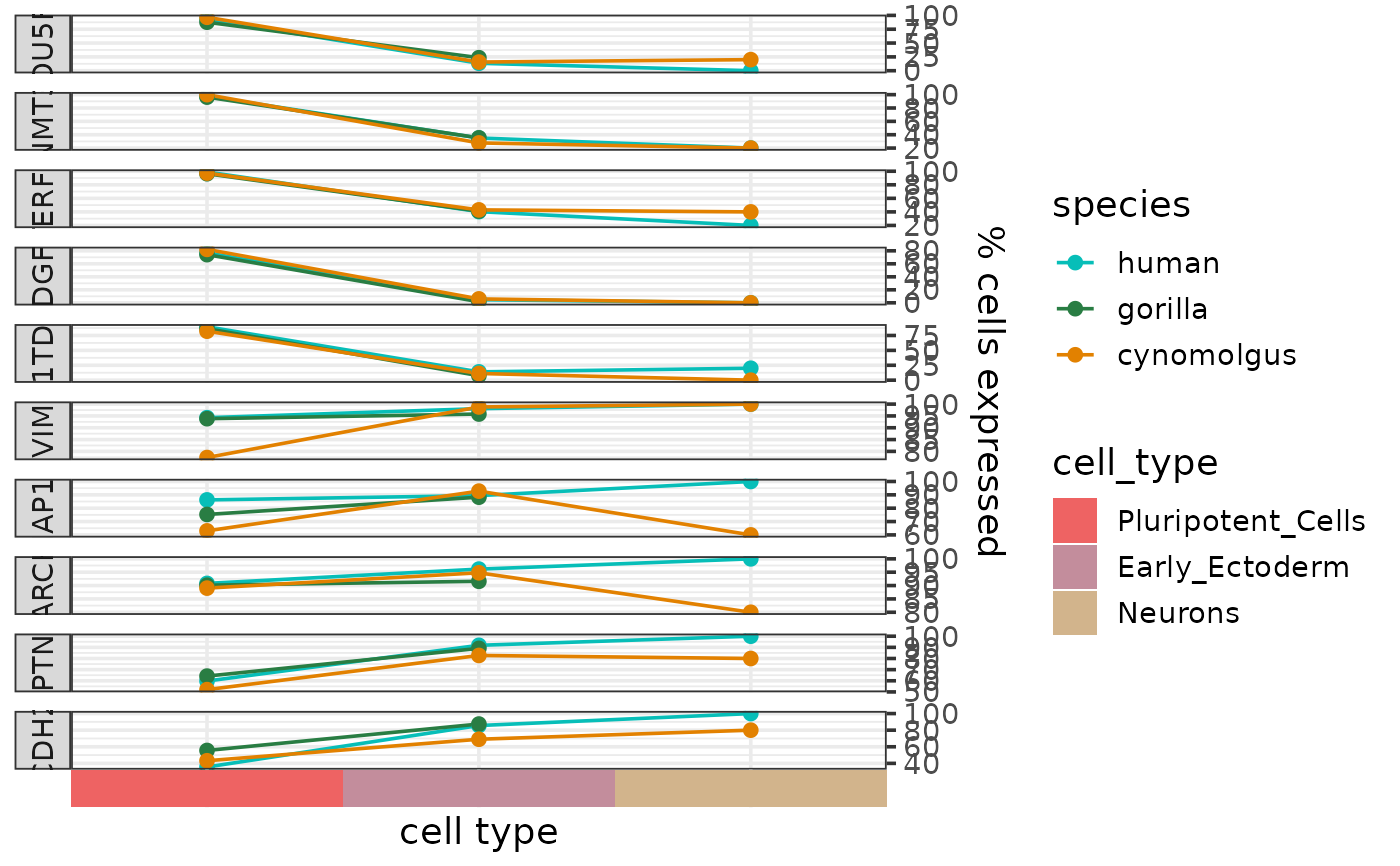 The summarized expression levels are then visualized as a scatter plot across the cell types, colored by species and faceted by gene. To aid visual comparison across species, the data points of the same species are connected by lines across the cell types (this is not meant to represent continuity).